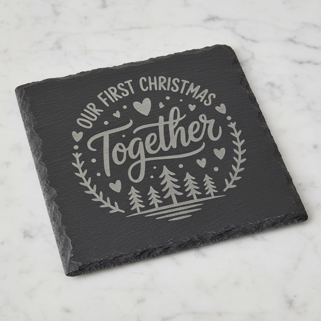 The intricate design showcases the phrase 'OUR FIRST CHRISTMAS Together' encircled by a festive wreath, adorned with sweet hearts and charming Christmas trees. It's a delightful reminder of your special bond, designed to bring a smile every time it's seen.✨ **Crafted from Natural Slate:**Each Each coaster is made from **genuine natural slate**, offering a rustic and elegant touch to any home decor. The inherent variations in the slate's texture and thickness (4-6mm) mean that *no two coasters are exactly alike*, making your gift truly one-of-a-kind. These natural characteristics add to its unique charm and character.🛡️ **Designed for Durability & Protection:**We understand the importance of both beauty and functionality. That's why each 100x100mm square coaster is:- **Sealed for Protection:** Ensures longevity and resistance to moisture.- **Fitted with Four Small Rubber Feet:** To prevent scratches and protect your precious surfaces.- **Easy to Care For:** Simply wipe clean with a damp cloth to maintain its pristine look.🏡 **Perfect for Any Occasion:**While ideal for a couple's *first Christmas together*, this coaster also makes a wonderful gift for:- Engagements- Weddings- Anniversaries- New Home Celebrations- Valentine's Day- Or simply as a thoughtful gesture to show someone you care! Bring joy and warmth to your home or surprise a loved one with this *sentimental and beautifully crafted* 'Our First Christmas Together' slate coaster. It's a timeless piece that will be treasured for many Christmases to come. Add a touch of personalised elegance to your festive celebrations!